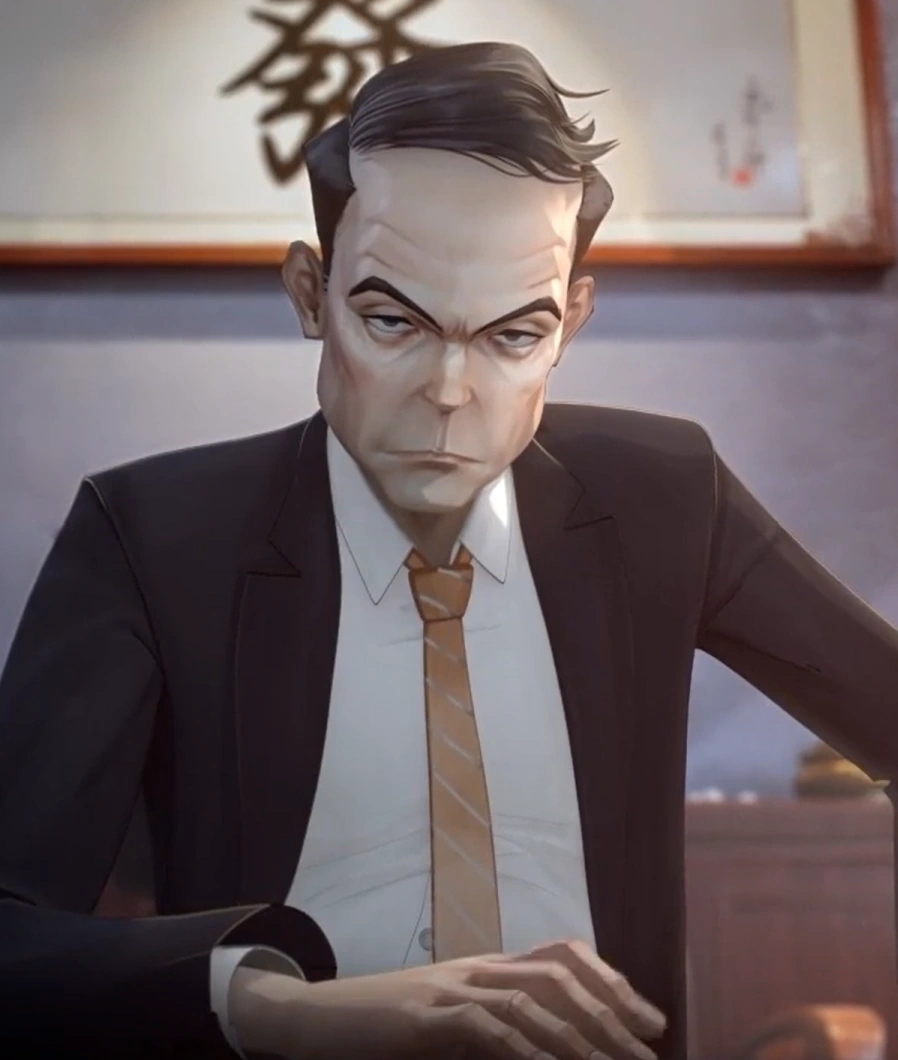 Cheng Yaojin is a middle aged old man with black hair and male pattern baldness, he wears a dark blue business suit.